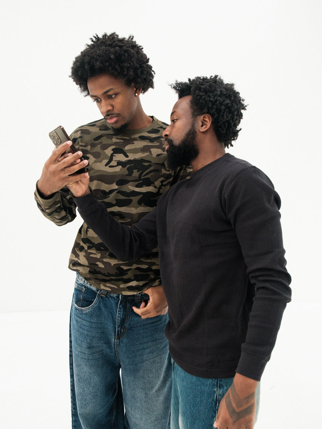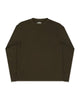 Person wearing an olive green long sleeve t-shirt on a white background